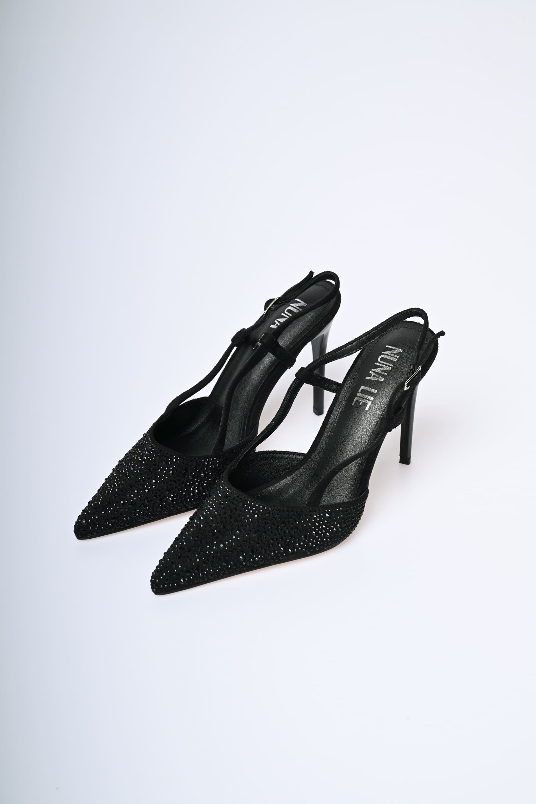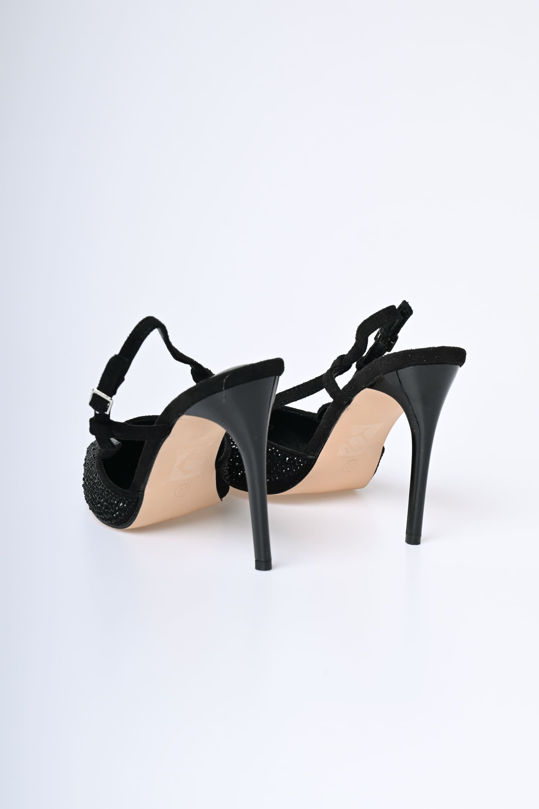 Décolleté slingback in similpelle scamosciata nera impreziosite da strass sulla punta affusolata e con classico cinturino posteriore regolabile e tacco alto.