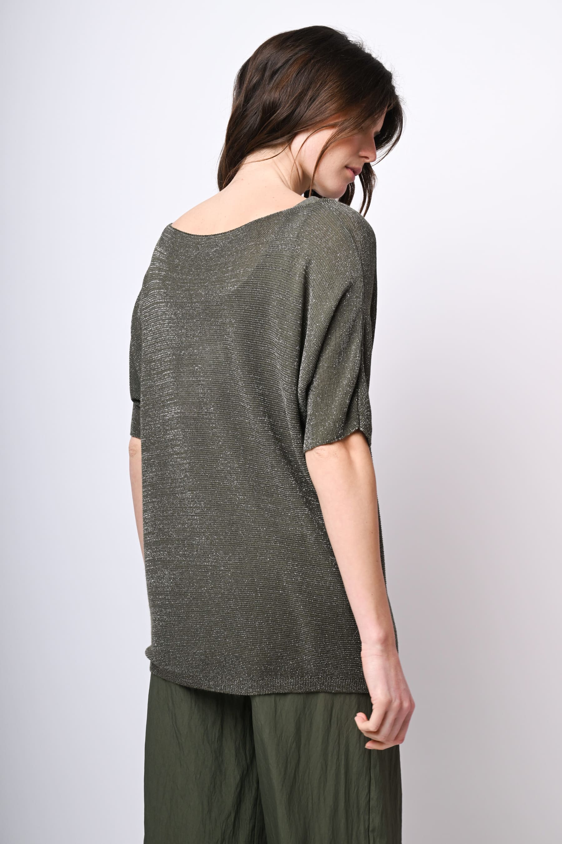 Top oversize in maglia lurex misto viscosa verde militare con scollo a barchetta e maniche crop a pipistrello.